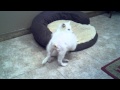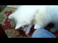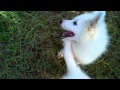 They eat 2 cups of Purina Pro Plan puppy am and pm. I will send what is left of the bag with them on the transport. I just put it in one big bowl and they share well. I have been bringing them to work with me, where they run wild during the day and harrass my co-workers (like any normal foster puppy would). They will bark for attention and seem to be jealous of the other one getting loving. They love everyone and will run right up to my office door when they hear someone coming. Of the 2, Daisy is more outgoing and playful. Bugsy is a bit more slow to greet you but he loves to "talk" and cuddle. Both love to have their bellies scratched...especially their chest between their front legs. They sleep in an xpen at night. If I am up late (midnight) and get up early (5:30 or 6am) they can make it with no accidents. They are pretty rough on puppy pads and would rather shred them than potty on them. ;) Daisy is doing better on her potty training than B but both are doing well. Bugsy has only had a couple of daytime accidents. We just started leash training this week and they are getting it. They are great in the crate but Daisy can be a bit hesitant to come out so I usually just reach in and get her. They love being held and will give kisses. They are good for baths, nail trimming, brushing, etc. Bugsy is especially good. I call him Buggie because he is my little lovebug! When they meet other dogs (I have 4 plus 1 other foster) they both tend to run up and bark and some dogs may be offended by their greeting. My crew is pretty used to nutty puppies and my Lab mix herds the Eskies around the yard and keeps them out of trouble with the other dogs. Bugsy tends to have a messy behind. I am not sure if it has something to do with him not having a tail or even a nub. He does a "poo poo dance" every time and goes more often (with less output) than Daisy. Both have normal stool...no diarrhea. I usually wipe B's bottom with a baby wipe. Sometime I even have to rinse his butt off in the sink. He could care less and is very good. When I first got them, both had mats but I ended up having to shave Bugsy's rear end because it was so matted with poop and hair. I will send some baby wipes on transport too. They are great to follow me around the house/office/yard. I call them my little ducklings. I will say "this way" or "come on guys" to keep them on the right track. They also know what "outside" means and will head for the door whether at work or home. When I have them outside at work, there is a step to get down to the grassy area. I say "step" before they get to it and both will slow down and then hop right up/down. They will run into the back of my legs if I stop suddenly but generally do well and don't crash into things. Sorry for the novel! I think they will transition well into a new home. I can't wait for you to meet them and thanks again for taking them into rescue!" Adoption applications from individuals/families with experience raising/training blind dogs are most welcome! More about Daisy of MDGood with Dogs, Good with Cats, Good with Kids Special Needs: Blind Whenever possible Eskie Rescuers United tries to adopt out its dogs locally (or at least to adopters in adjoining states to where I'm being fostered). Please note that ERU processes LOCAL adoption applications before considering those from out of state. Videos of Daisy of MD: